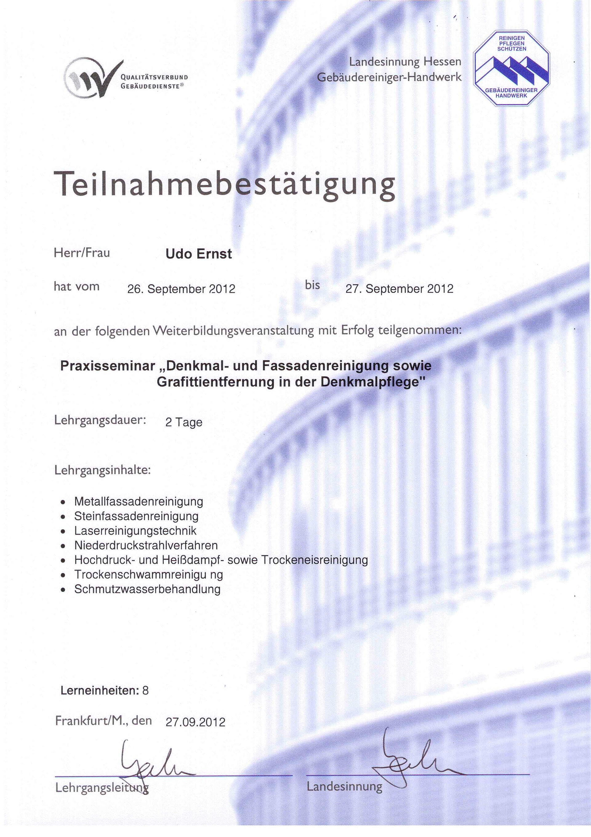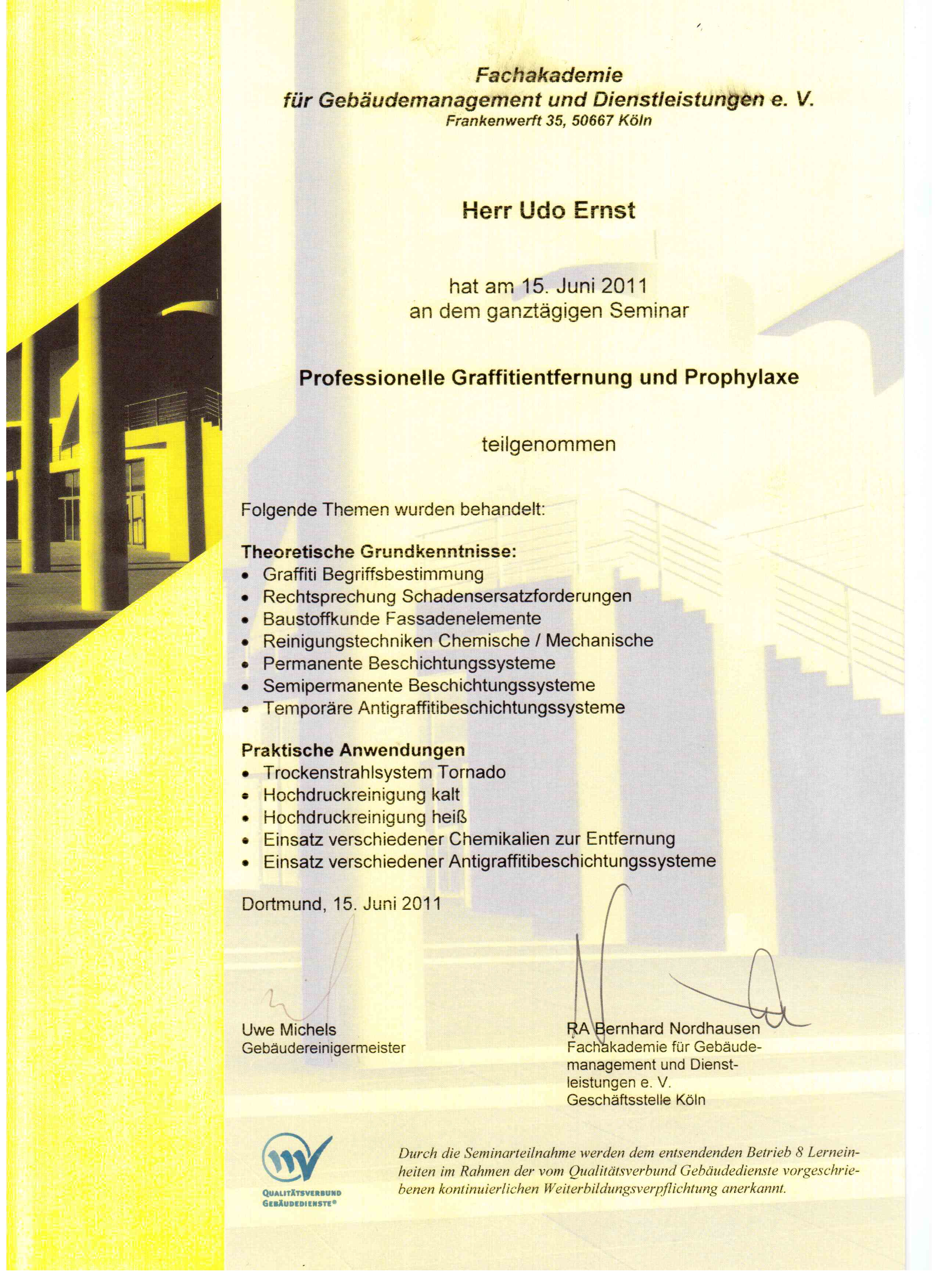 Unsere Anwendungstechniker haben nach einer fundierten Ausbildung und einer streng überwachten Prüfung durch den TÜV Rheinland ihre fachliche Qualifikation unter Beweis gestellt. Theorie und Praxis — von der Materialkunde über umweltschonende Verfahren bis hin zu fachgerechter Graffiti-Entfernung und Schutz — sind Teil dieser Schulung.