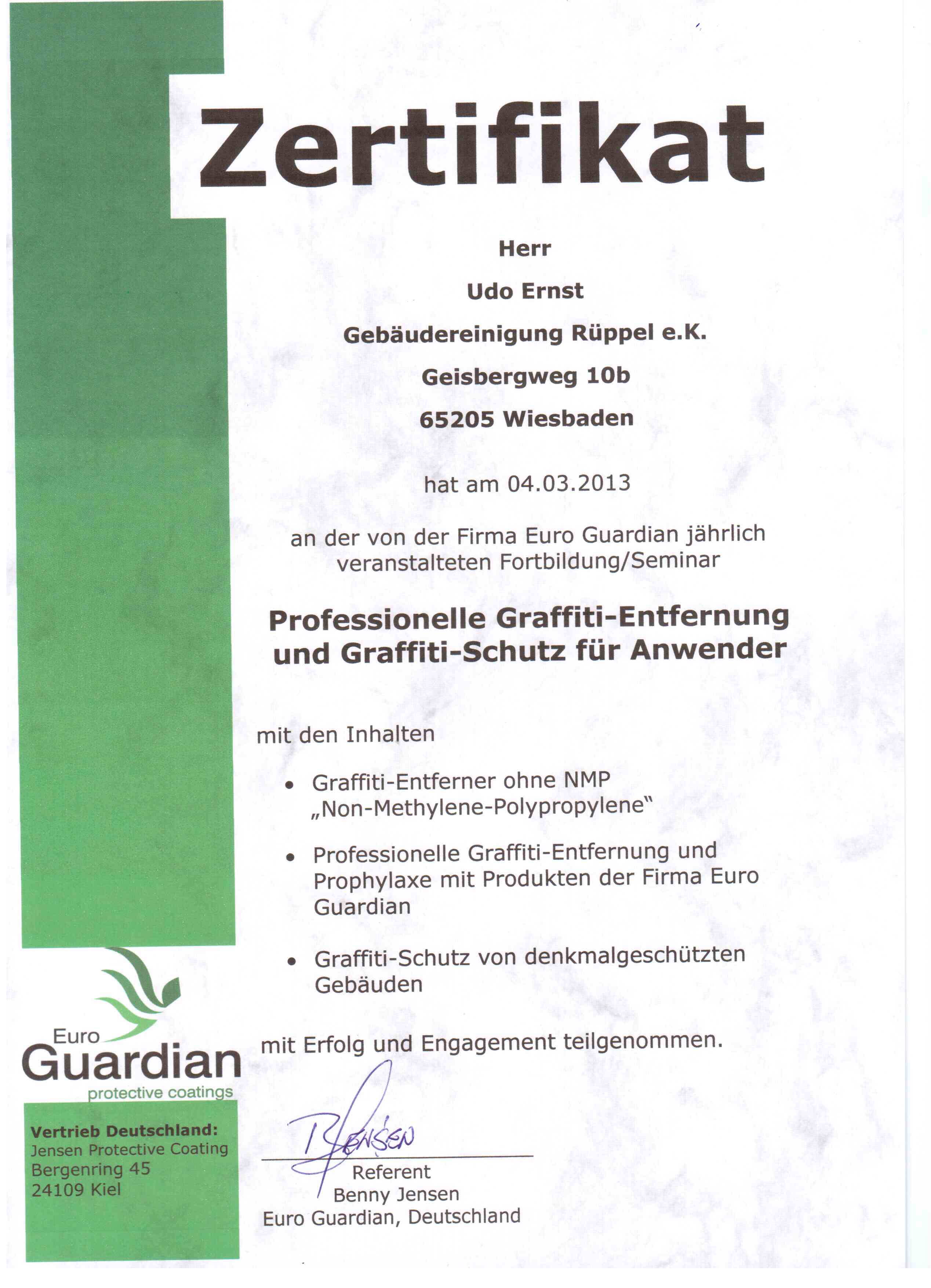 Als zertifiziertes Anti-Graffiti-Unternehmen verfügen wir über das offizielle TÜV-Prüfzeichen — ein Beleg dafür, dass unsere Leistungen höchsten Qualitäts-, Umwelt- und Sicherheitsstandards entsprechen.